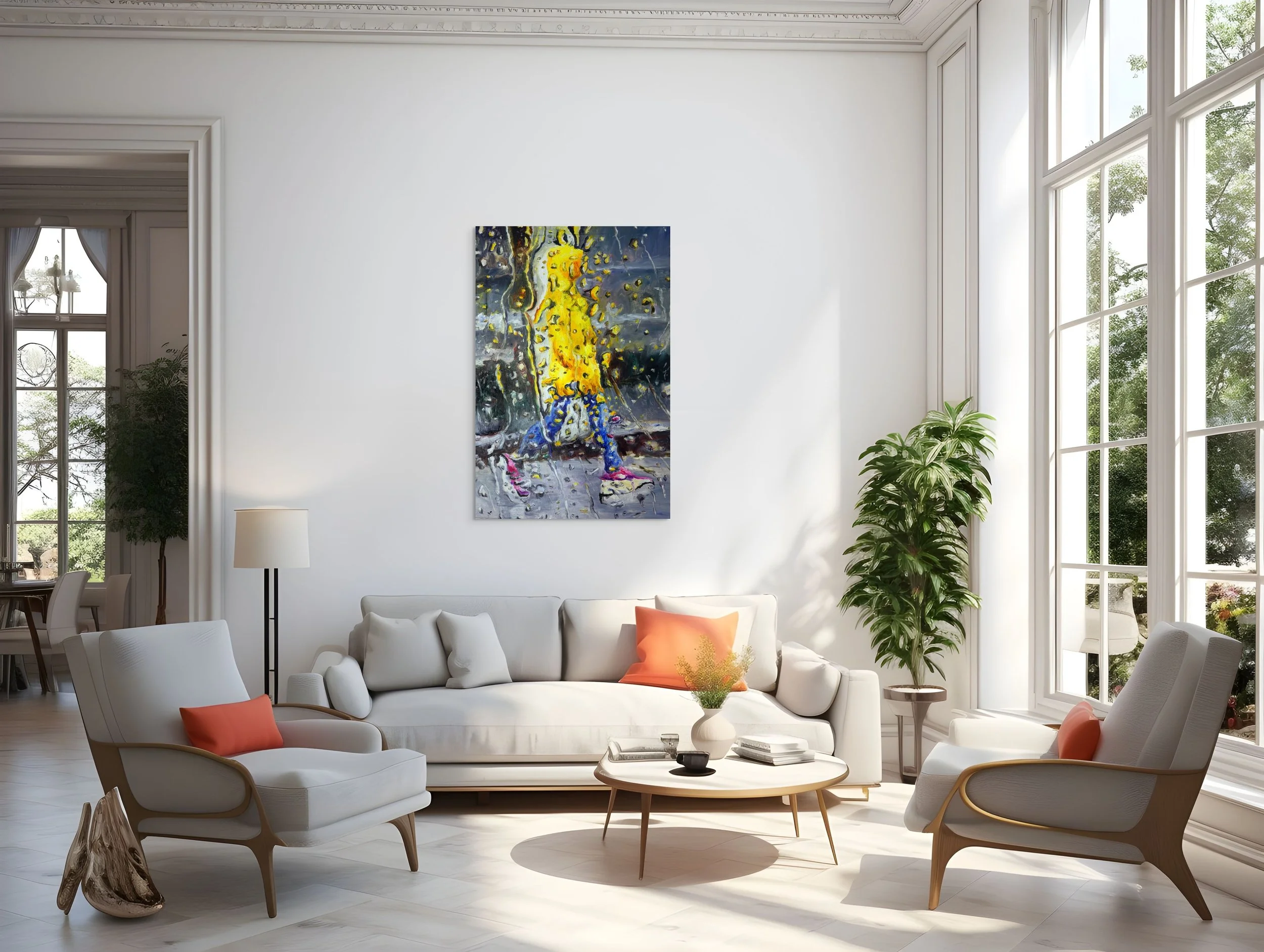 Durch die Verzerrung der Regentropfen entsteht eine lebendige, fast abstrakte Bewegung: ein gelber Mantel, blaue Schritte, Lichtreflexe – alles verwoben zu einem dynamischen, fließenden Bild.