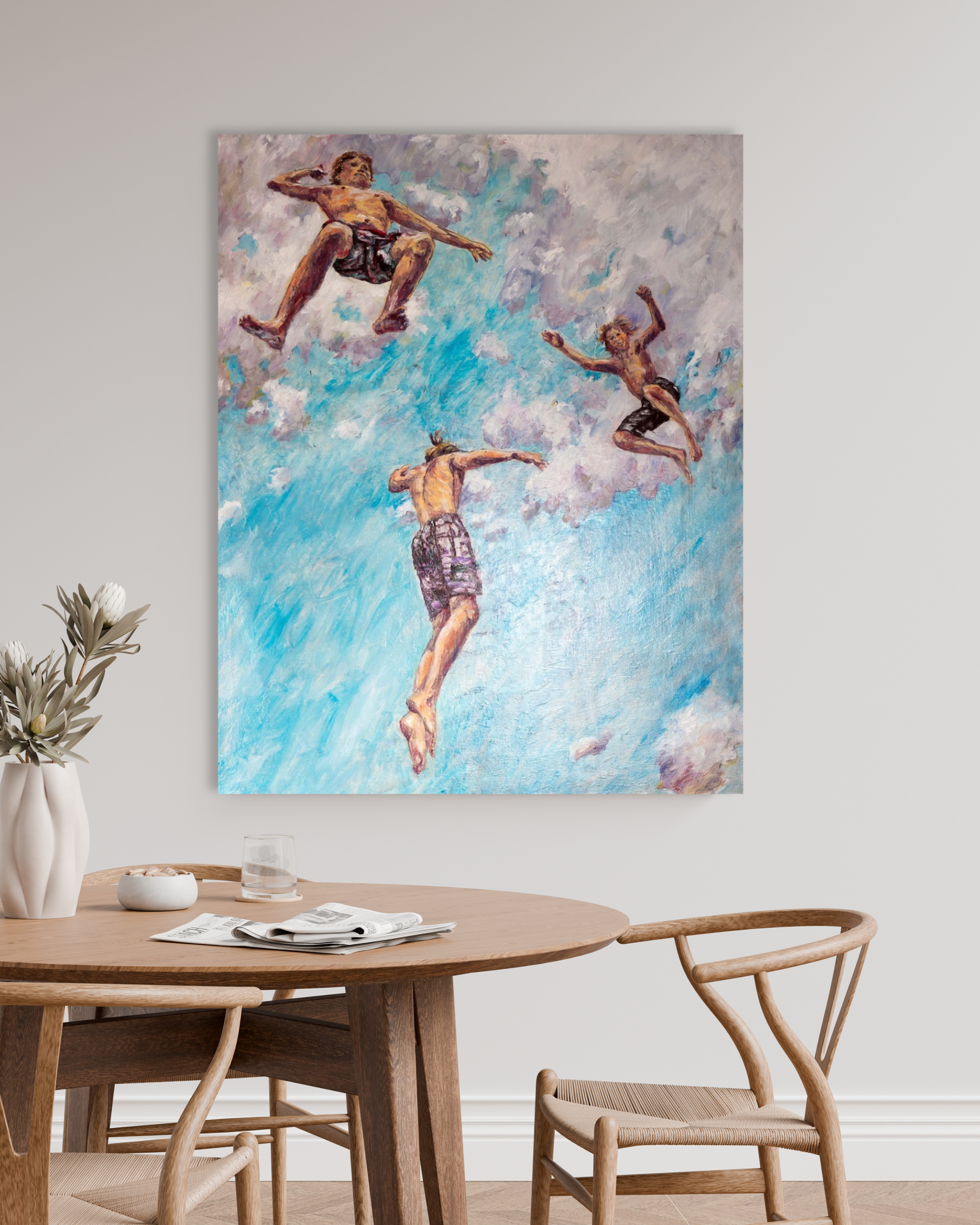 „Fallen II“ ist ein Ölgemälde auf Leinwand (2023), das den Moment des Schwebens einfängt – Körper in der Luft, getragen von Licht, Bewegung und einer weichen, wolkigen Atmosphäre.
