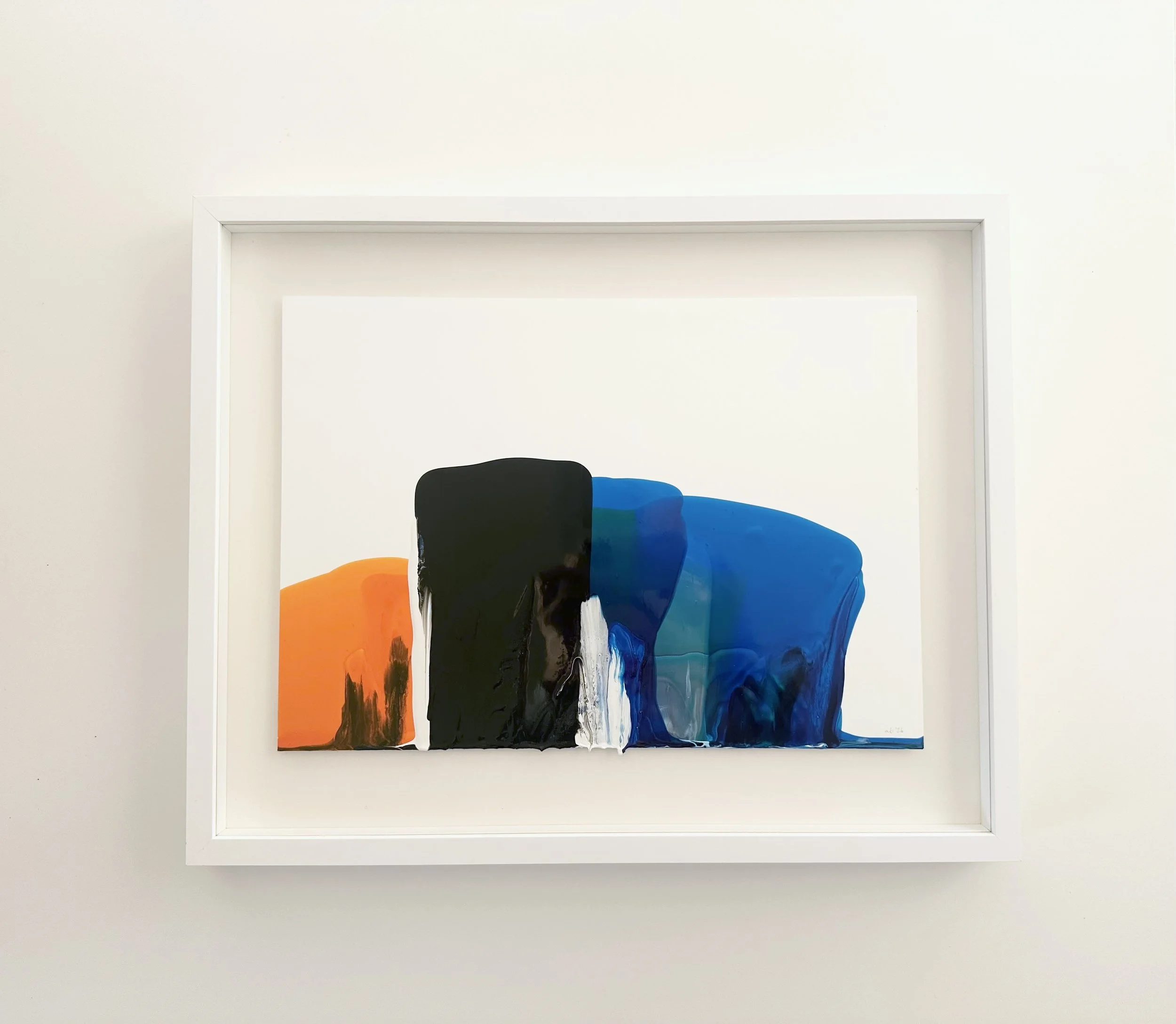 Der unberührte weiße Bildgrund fungiert als Resonanzraum für diese farbigen Eingriffe. Er hält Distanz und schafft eine optische Schwebe, in der sich Leere und Masse, Fläche und Raum, Ruhe und Bewegung überlagern.