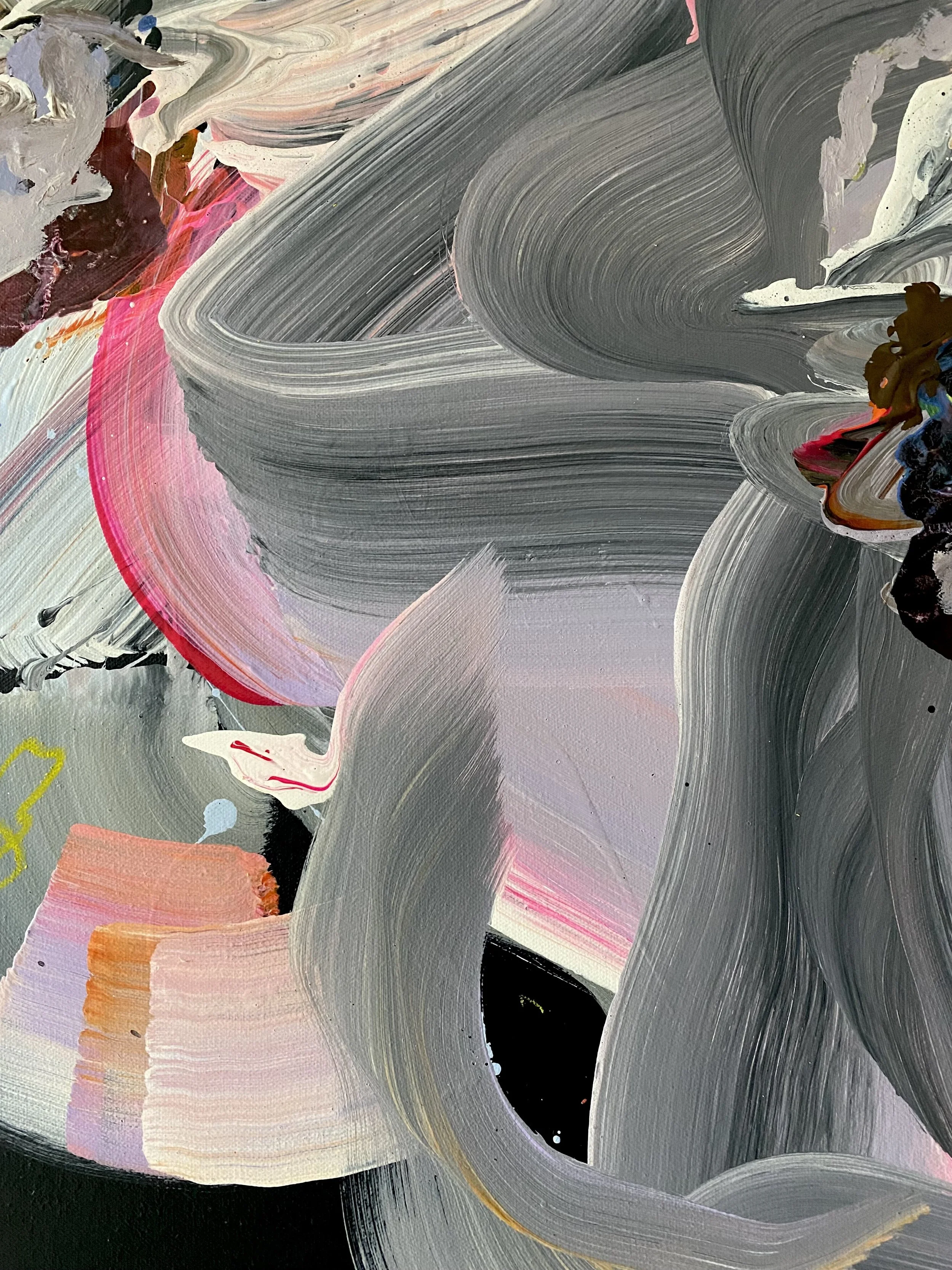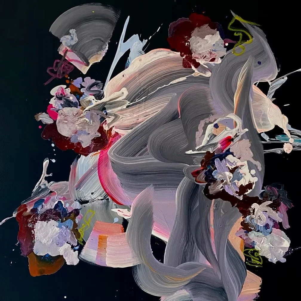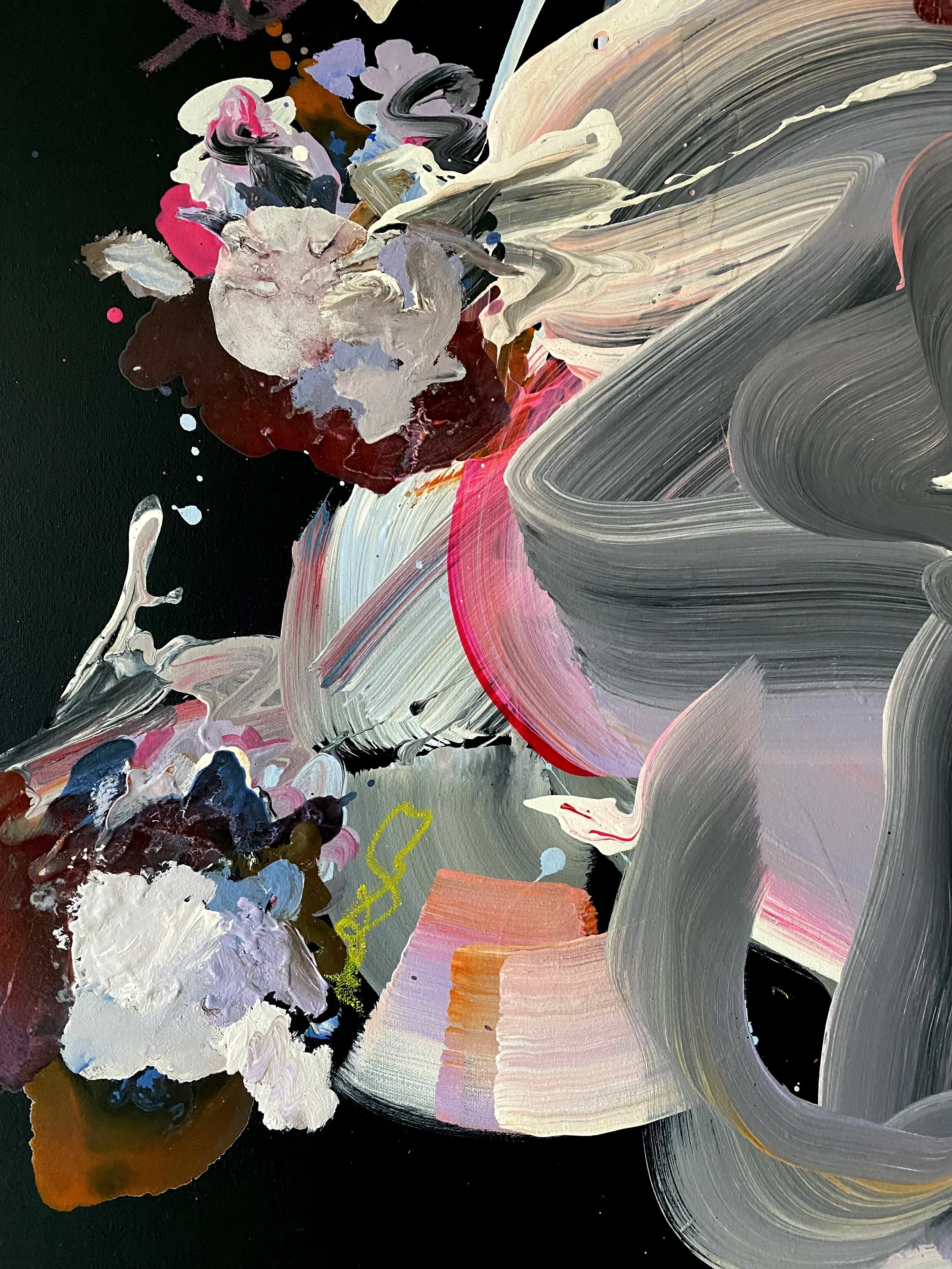 Auf einem tiefschwarzen Grund entfaltet sich ein dynamisches Geflecht aus Acryl- und Ölfarben, das sich jeder schnellen Kategorisierung entzieht. Es ist eine visuelle Auseinandersetzung mit der Gleichzeitigkeit von Gedankenströmen und emotionalen Prozessen.